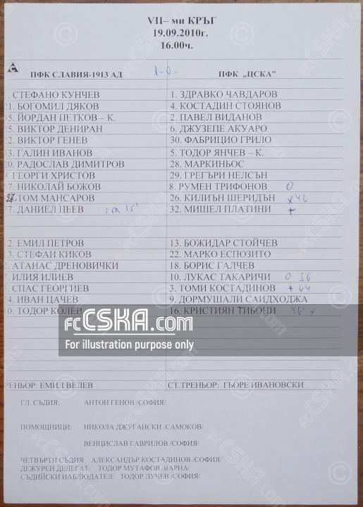 CSKA lost against Slavia 1913 (Sofia) with result 1:0 in match from 7th round of „А“ Football Group 2010/11 played on 19 September 2010 at 16:00 on „Slavia“ stadium, in Sofia.