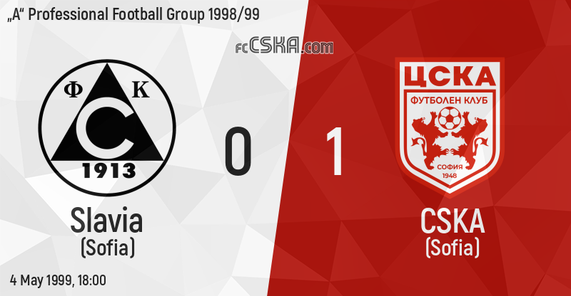 CSKA won against Slavia (Sofia) with result 0:1 in match from 26th round of „А“ Professional Football Group 1998/99 played on 4 May 1999 at 18:00 on „Vasil Levski“ stadium, in Sofia. goalscorer for the army men was Valentin Stanchev (2′).