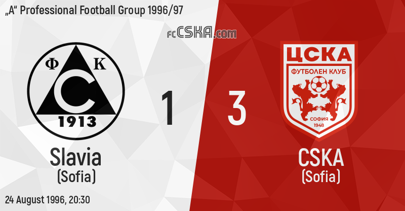 CSKA won against Slavia (Sofia) with result 1:3 in match from 3rd round of „А“ Professional Football Group 1996/97 played on 24 August 1996 at 20:30 on „Vasil Levski“ stadium, in Sofia. goalscorers for the army men were Ilia Voynov (31′), Ivaylo Andonov (64′) and Dobromir Mitov (80′).