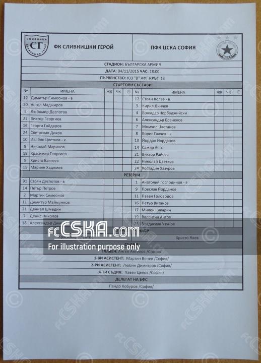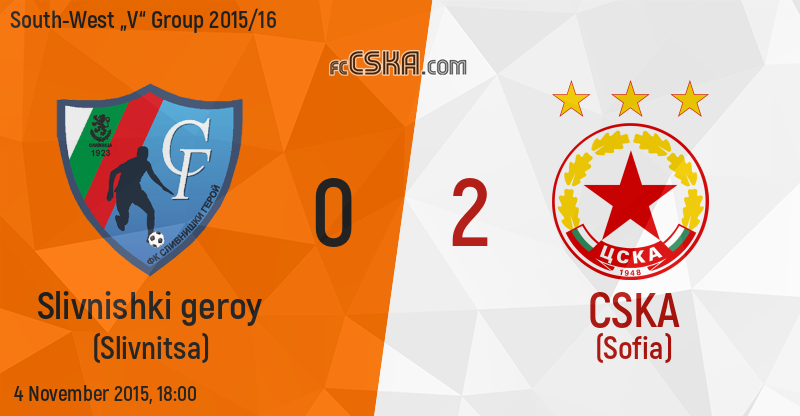 CSKA won against Slivnishki geroy (Slivnitsa) with result 0:2 in match from 13th round of South-West „V“ Group 2015/16 played on 4 November 2015 at 18:00 on „Bulgarska armia“ stadium, in Sofia. goalscorers for the army men were Preslav Yordanov (72′) and Petar I. Vitanov (87′).