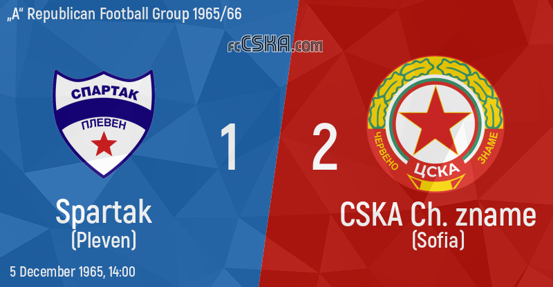 CSKA „Cherveno zname“ won against Spartak (Pleven) with result 1:2 in match from 13th round of „А“ Republican Football Group 1965/66 played on 5 December 1965 at 14:00 on „Slavi Aleksiev“ stadium, in Pleven. goalscorers for the army men were Nikola Tsanev (29′) and Dimitar Yakimov (86′ from penalty).