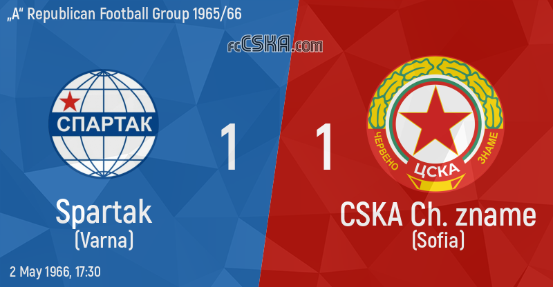 CSKA „Cherveno zname“ draw against Spartak (Varna) with result 1:1 in match from 23rd round of „А“ Republican Football Group 1965/66 played on 2 May 1966 at 17:30 goalscorer for the army men was Dimitar Penev (2′).