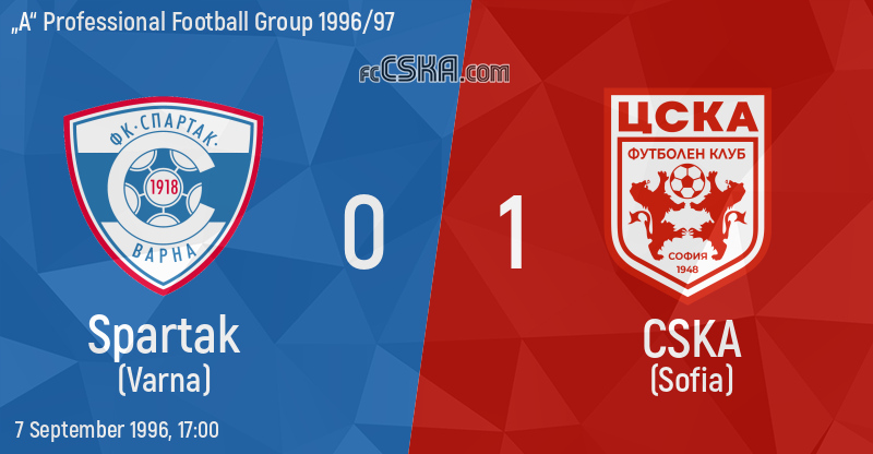 CSKA won against Spartak (Varna) with result 0:1 in match from 4th round of „А“ Professional Football Group 1996/97 played on 7 September 1996 at 17:00 goalscorer for the army men was Ivaylo Andonov (4′).