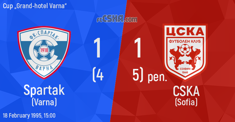 CSKA draw against Spartak (Varna) with result 1:1 in match from Final of Cup „Grand-hotel Varna“ played on 18 February 1995 at 15:00 goalscorers for the army men were Petar Mihtarski (38′ from penalty and 95′ from penalty), Metodi Deyanov (95′ from penalty), Dobromir Mitov (95′ from penalty), Anatoli Nankov (95′ from penalty) and Ilian Kiryakov (95′ from penalty).