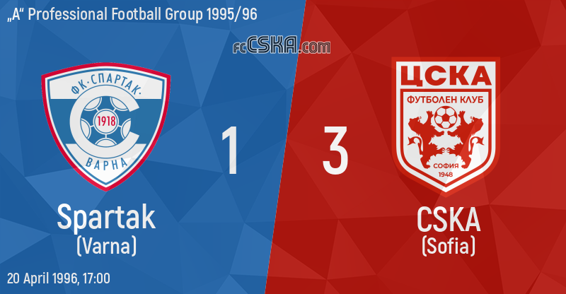 CSKA won against Spartak (Varna) with result 1:3 in match from 27th round of „А“ Professional Football Group 1995/96 played on 20 April 1996 at 17:00 goalscorers for the army men were Georgi Donkov (6′ and 80′) and Petar Mihtarski (86′).