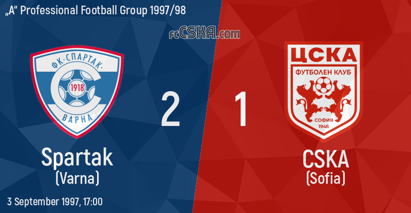 CSKA lost against Spartak (Varna) with result 2:1 in match from 5th round of „А“ Professional Football Group 1997/98 played on 3 September 1997 at 17:00 goalscorer for the army men was Petar Zhabov (69′).