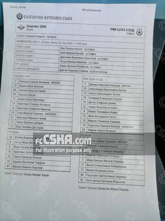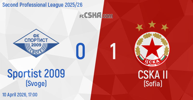 CSKA II won against Sportist 2009 (Svoge) with result 0:1 in match from 28th round of Second Professional League 2025/26 played on 10 April 2026 at 17:00