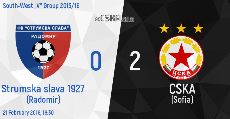 CSKA won against Strumska slava 1927 (Radomir) with result 0:2 in match from 18th round of South-West „V“ Group 2015/16 played on 21 February 2016 at 18:30 on „Bulgarska armia“ stadium, in Sofia. goalscorers for the army men were Boris Galchev (44′) and Preslav Yordanov (91′).