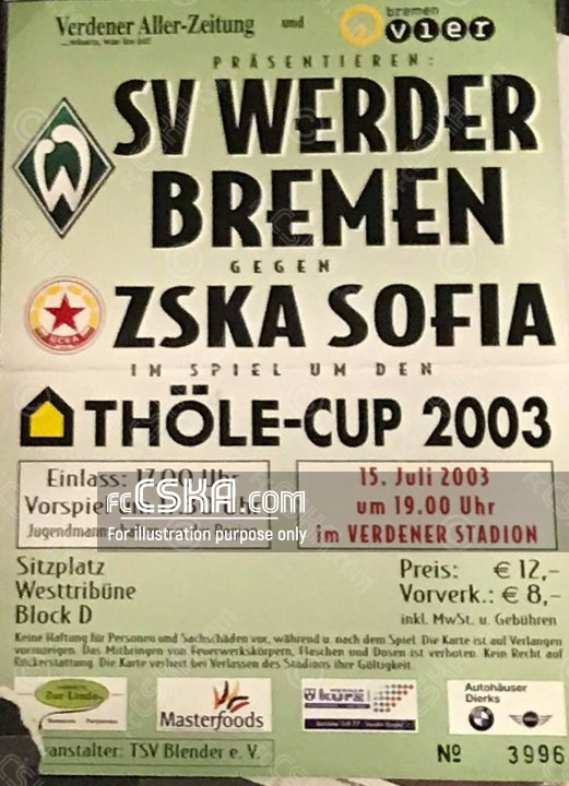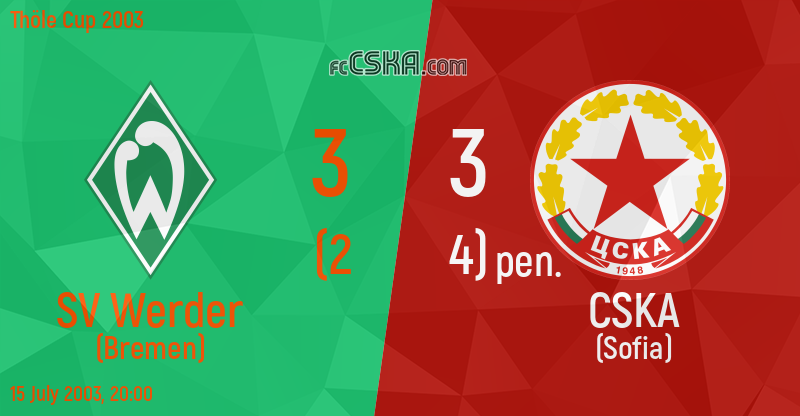 CSKA draw against SV Werder (Bremen) with result 3:3 in match from Thöle Cup 2003 played on 15 July 2003 at 20:00 goalscorers for the army men were MacDonald Mukansi (4′, 15′ and 20′), João Carlos (95′ from penalty), Svetoslav Petrov (95′ from penalty), Hristo Yanev (95′ from penalty) and Stoyan Kolev (95′ from penalty).