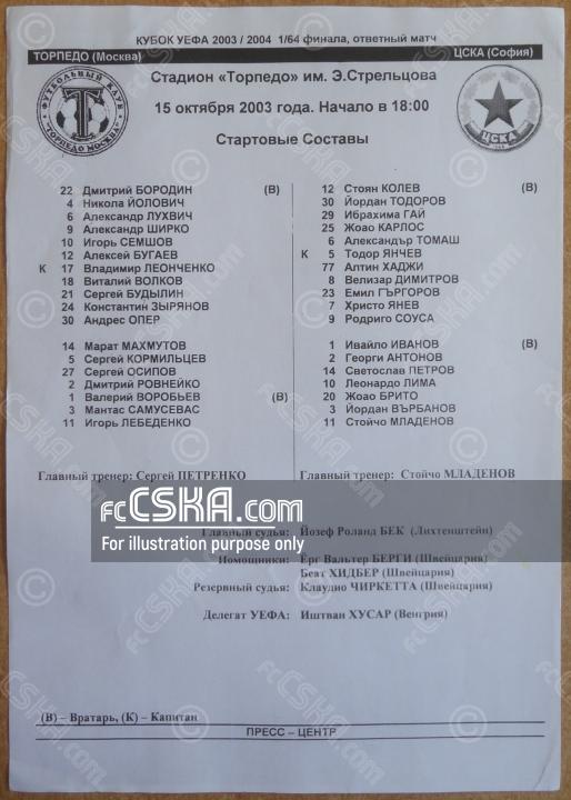 CSKA draw against Torpedo (Moscow) with result 1:1 in match from First round — Second Leg of UEFA Cup 2003/04 played on 15 October 2003 at 17:00 goalscorers for the army men were Velizar Dimitrov (92′), Leonardo Lima (127′ from penalty) and Stoyan Kolev (127′ from penalty).