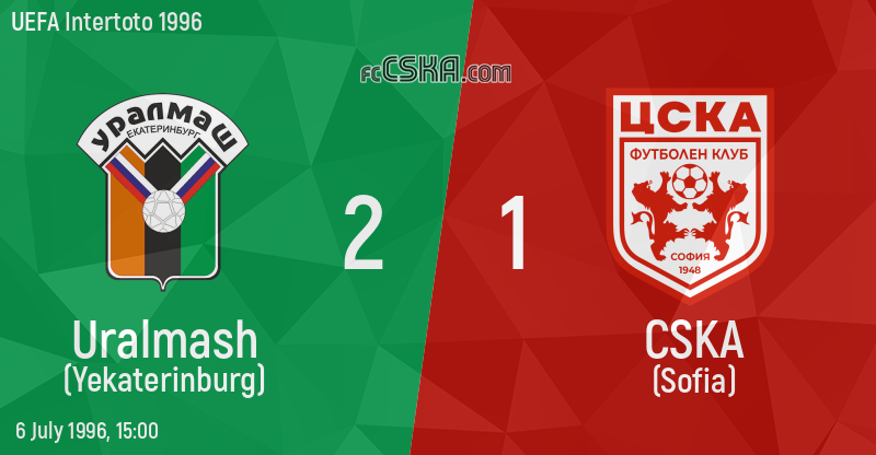 CSKA lost against Uralmash (Yekaterinburg) with result 2:1 in match from Group 11 — third round of UEFA Intertoto 1996 played on 6 July 1996 at 15:00 goalscorer for the army men was Ivo Slavchev (20′).