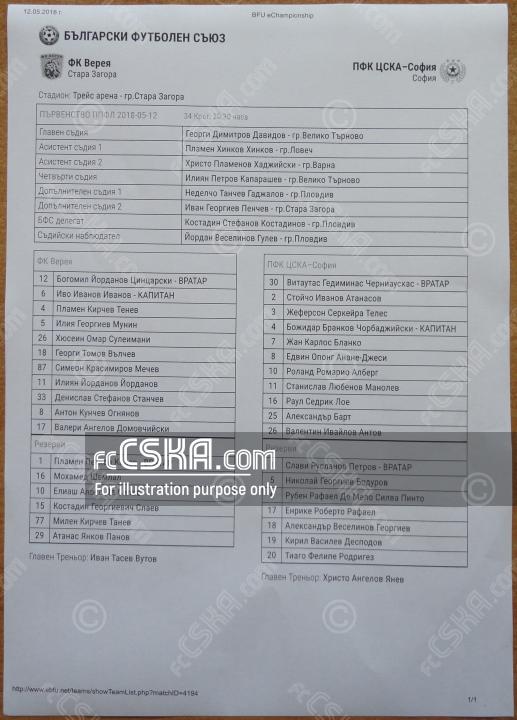 CSKA won against Vereya (Stara Zagora) with result 0:2 in match from 34th round of First Professional League 2017/18 - first six played on 12 May 2018 at 20:15 goalscorers for the army men were Alexandre Barthe (64′) and Roland Alberg (72′).