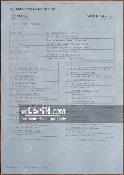 CSKA won against Vereya (Stara Zagora) with result 0:5 in match from 21st round of First Professional League 2017/18 played on 17 February 2018 at 15:00 goalscorers for the army men were Fernando Karanga (3′ and 62′), Henrique (16′), Roland Alberg (78′) and Jean Blanco (89′).