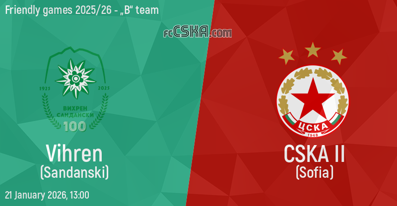 CSKA II will play with Vihren in match from Friendly games 2025/26 - „B“ team on 21 January 2026 at 13:00 on „Sports centre „Yulii Tushev"“ stadium, in Valkovo.