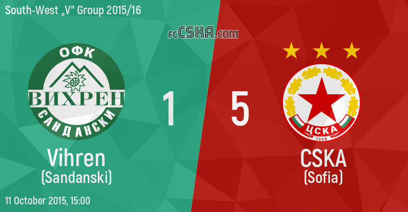 CSKA won against Vihren (Sandanski) with result 1:5 in match from 10th round of South-West „V“ Group 2015/16 played on 11 October 2015 at 15:00 goalscorers for the army men were Yordan Yordanov (7′), Nikolay Tsvetkov (10′ and 31′) and Kostadin Hazurov (33′ and 43′).