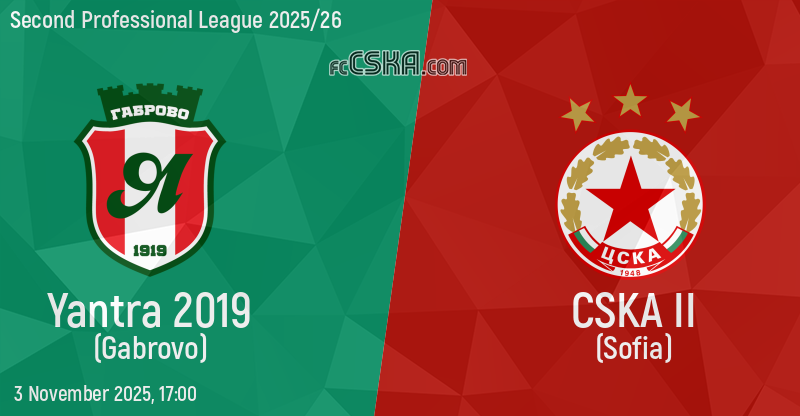 CSKA II will play with Yantra in match from 14th round of Second Professional League 2025/26 on 3 November 2025 at 17:00 on „Hristo Botev“ stadium, in Gabrovo.